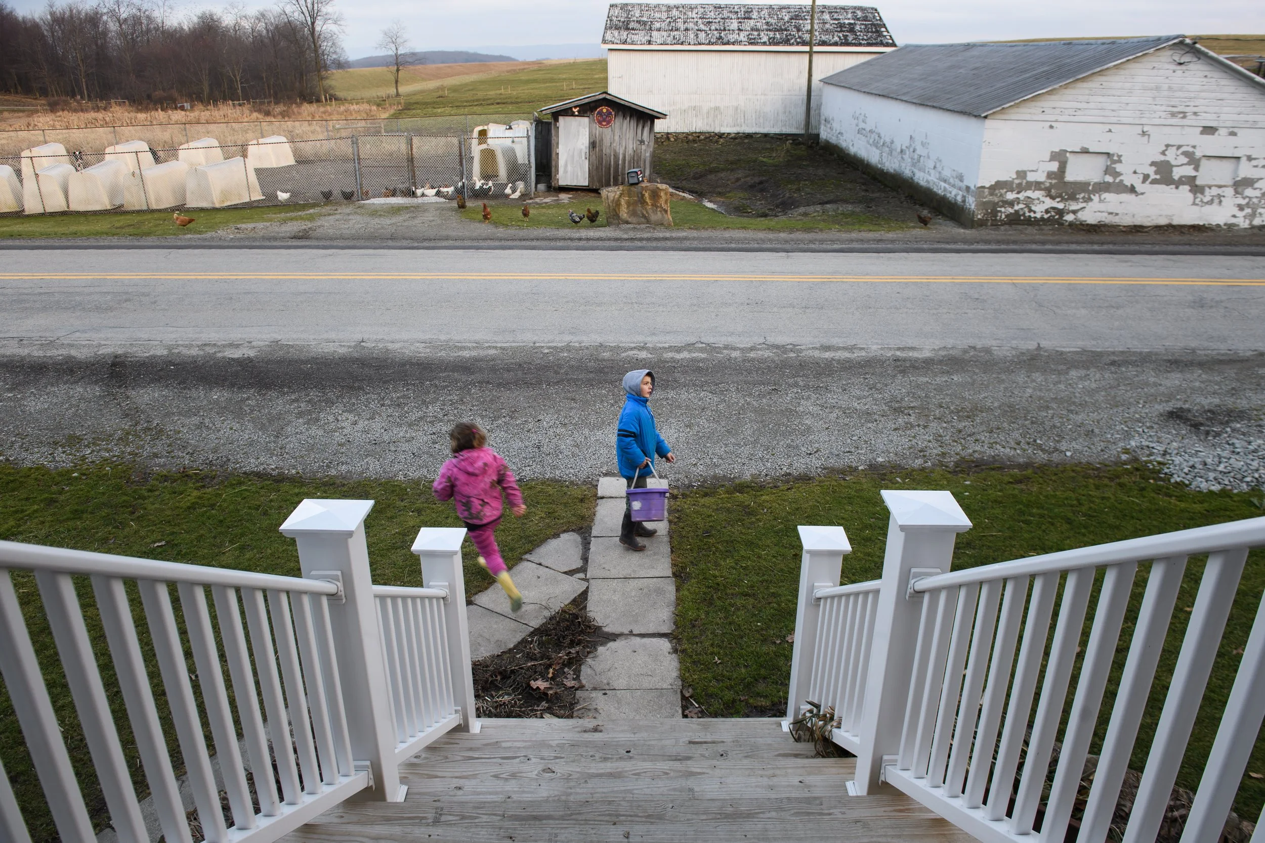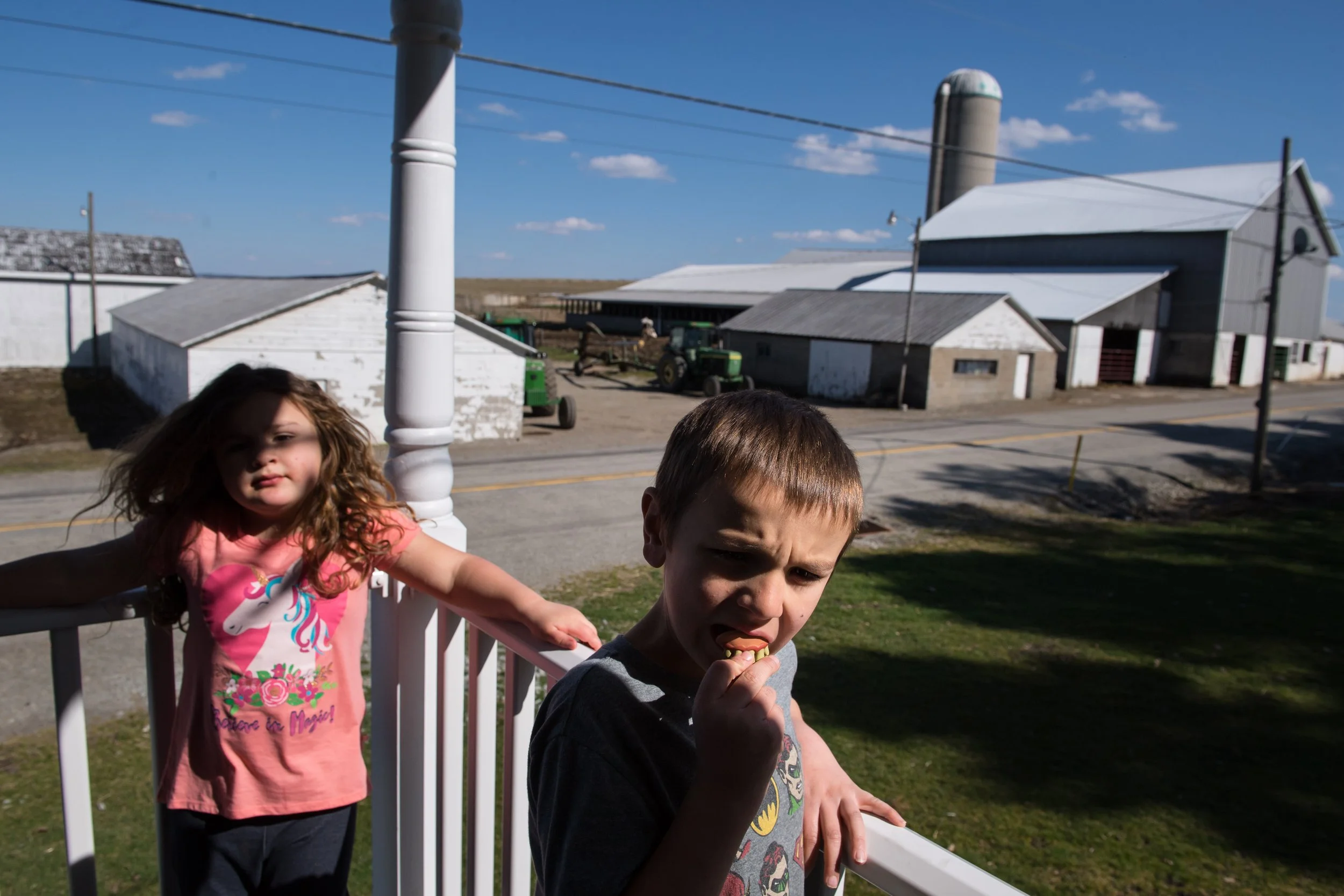 Nellie Brown, left, 6, lounges on the porch bannister as her brother Oliver, 7, fumbles with a set of toy teeth at their family farm straddling Saltlick and Bullskin, Pa. Behind them, the milkbarn where their father, Ben Brown, milks their some 50 to 60 head of cattle twice a day.