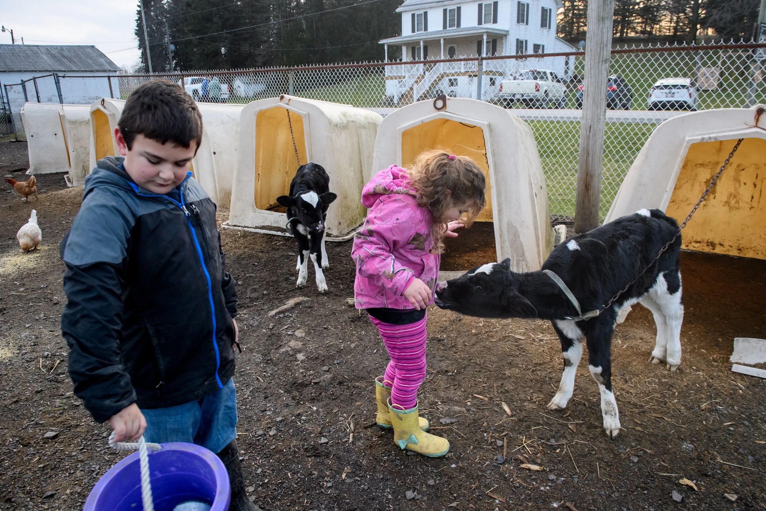 Anthony Brown, left, 8, carries a bucket of feed as his sister Nellie gets a lick from a baby calf as they do their daily farm chores. Once Anthony gets a bit older and stronger, he will be expected to help with the milking on the weekends, a job his mother thought she would be helping with before her body was hit hard by breast cancer.