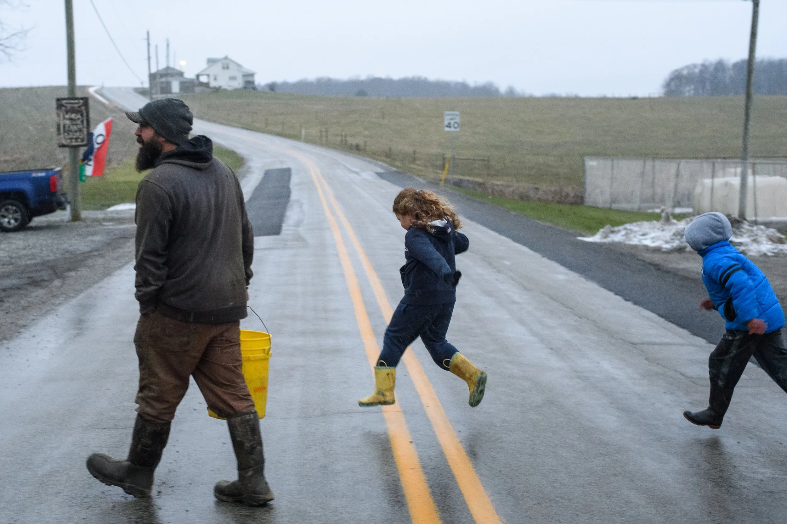 Ben Brown, and his children, Nellie and Oliver, cross the road between the barnyard and their house after feeding the calves. Raised on the land, Ben feels dairy farming is something you are called to do. The Browns have struggled as the price for milk has plummeted nationally, and Ben and his wife worry they will be the first generation to lose the family farm.