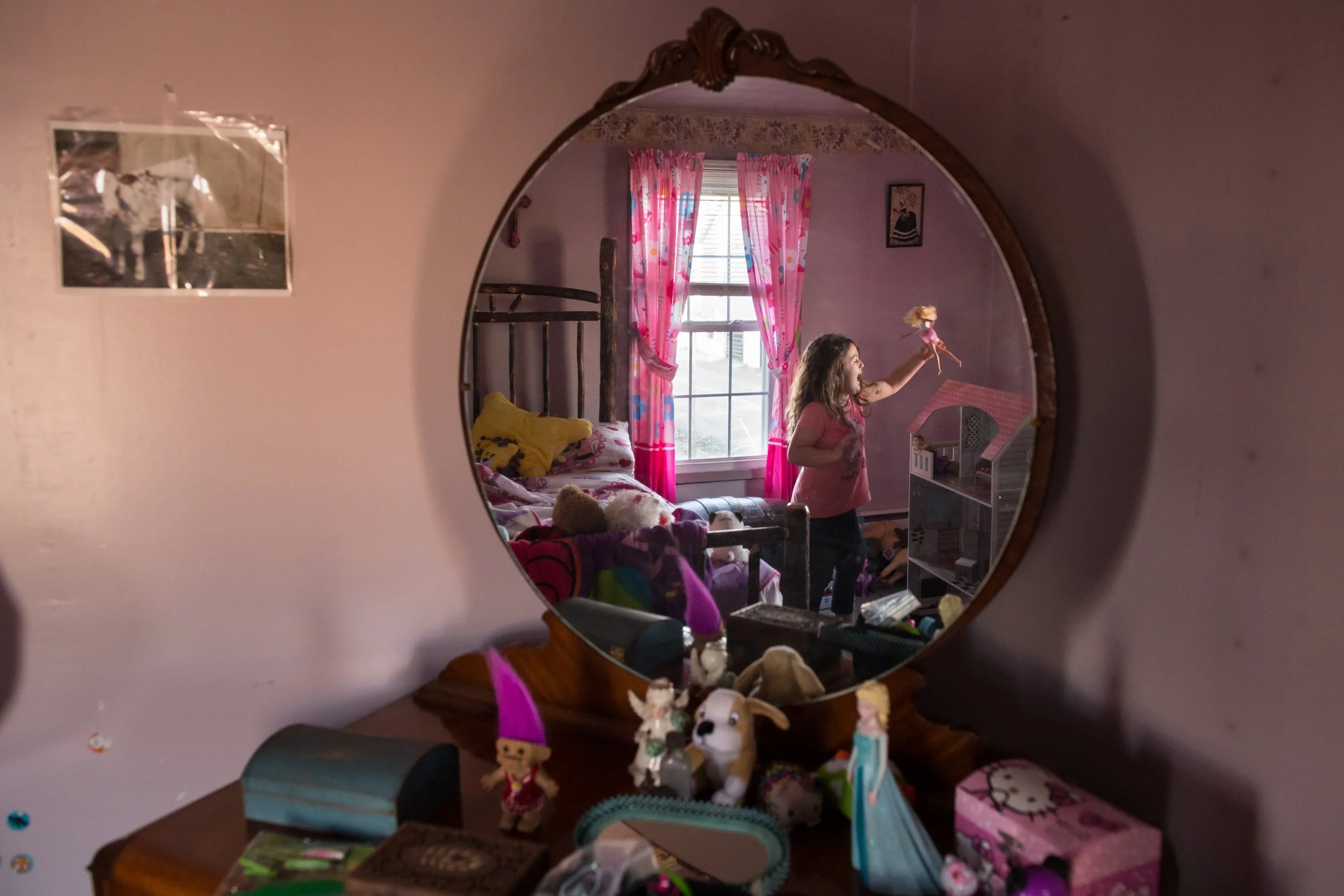 Nellie is reflected in her dresser mirror as she plays with her dolls in the dollhouse she got for her birthday. Nellie’s parents saved the dollhouse, which was part of their Christmas gifts donated by Toys for Tots, to give to Nellie on her birthday. Living in the shadow of breast cancer, Mary Beth worries about not being there as a mother for Nellie’s formative years as a young woman.